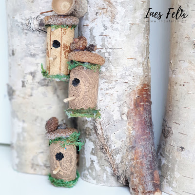Ich sammle jedes Jahr im Herbst Eicheln, um die dann zu bemalen oder eine Herbstdeko draus zu machen. Gesammelt habe ich auch im letzten Herbst aber wahrscheinlich aus Zeitgründen nichts daraus gemacht. Die Eicheln sind irgendwann etwas vertrocknet, aber die Hütchen halten sich sensationell gut. Also habe ich Korken genommen, ein Loch reingemacht, etwas Moos darum gewickelt und ein Eichelhütchen drauf gesetzt. Fertig ist das Vogelhaus. Ich finde die megasüß!